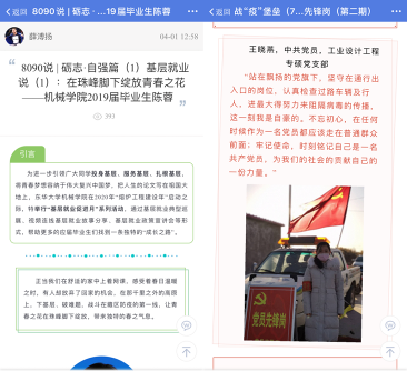 疫情防控工作开展以来,机械工程学院针对特殊时期的教育特点、教育要求和教育挑战,以“共抗疫情、爱国力行”为主题,围绕立德树人根本任务,立足校本文化,将五育并举的全面要求对应校训的关键要素,分篇章开展主题宣传教育活动,面向全院师生做好新时代爱国主义教育,激励学生培养修身立德、博学专攻、磨心砺志、求真求新、德才兼备的时代品格。